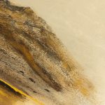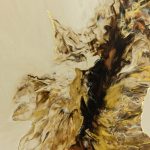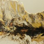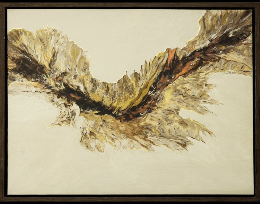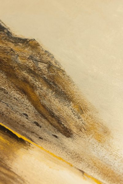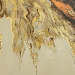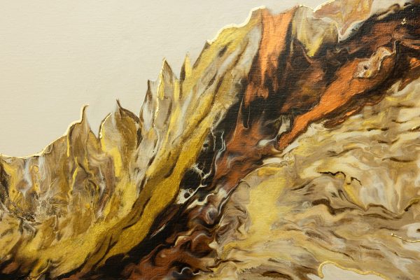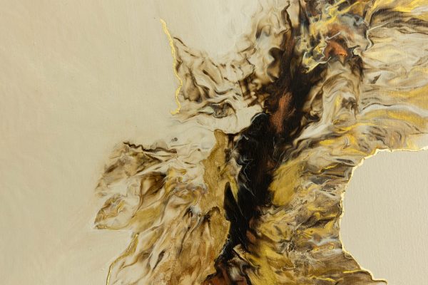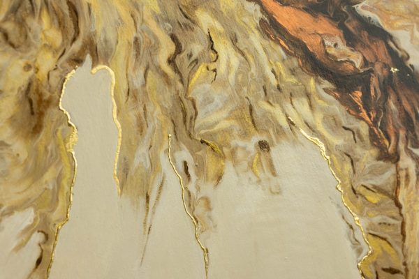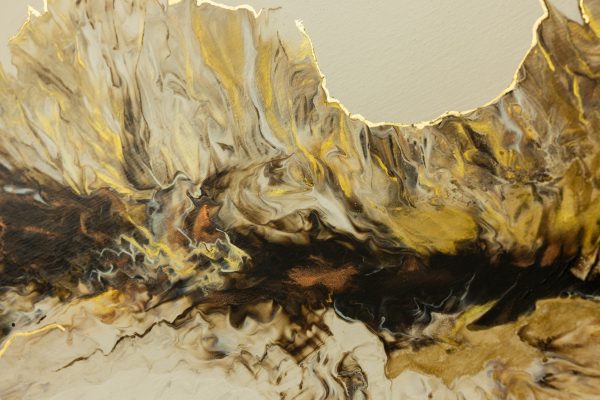 “The Edge of Becoming” traces a quiet moment of transformation — where light shifts, forms flow, and something new begins to emerge. Mixed media with gold leaf and hand painted embellishments that add detail and definition to movement.