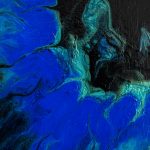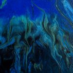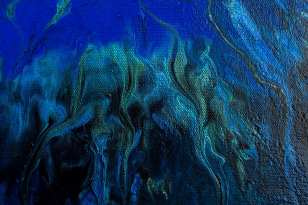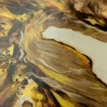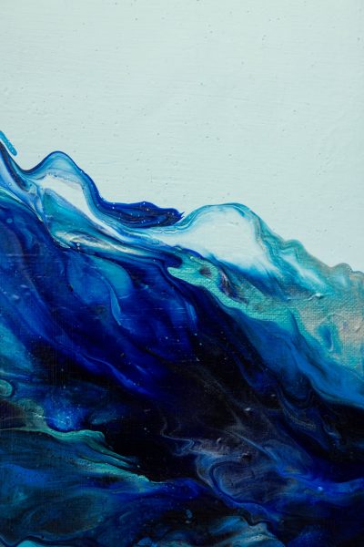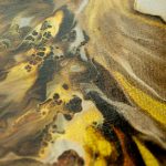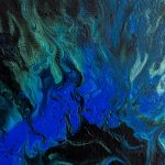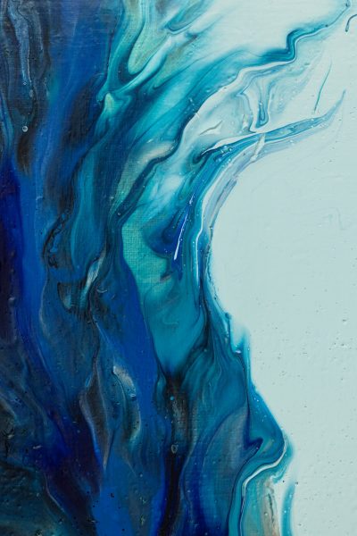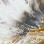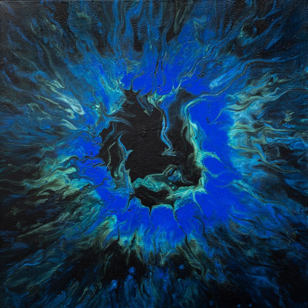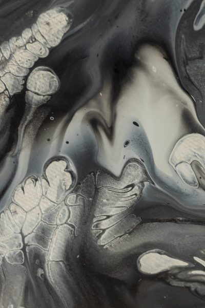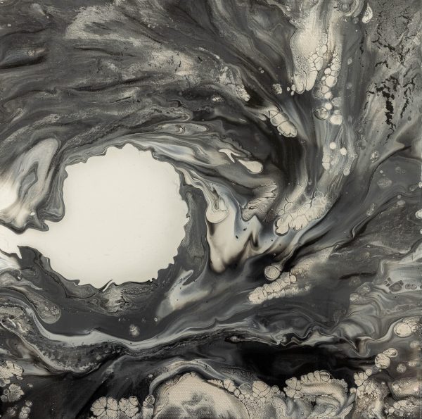 This painting captures the raw and fluid motion of the sea through an abstract lens. In this monochrome composition swirling shades of black, white, silver and grey converge in a mesmerizing dance that evokes both turbulence and tranquillity. The central light void draws the viewer inwards, suggesting the crest of an immense ocean wave suspended in time, inviting reflection on the balance between chaos and calm.