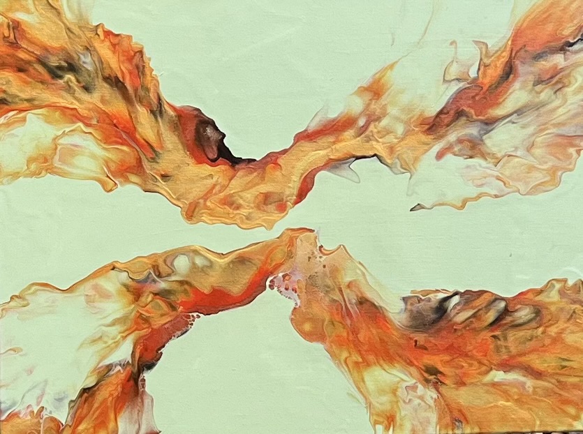 Sage green background with a variety of complimenting green, bronze and bronze used in this piece which I have hand painted on top of the Dutch pour to create interesting detail and definition. Look closely, can you see the horse.